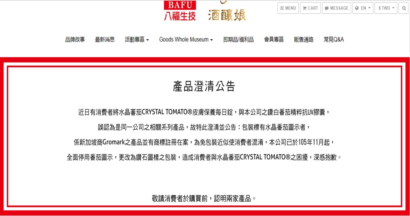 A company in Taiwan, 八福健康生技有限公司 (“Bafu”), has published an apology and undertaking to Gromark Consumers Enterprise Pte Ltd for infringing its Crystal Tomato® intellectual property rights by importing, storing and selling/offering products under a confusingly similar packaging.